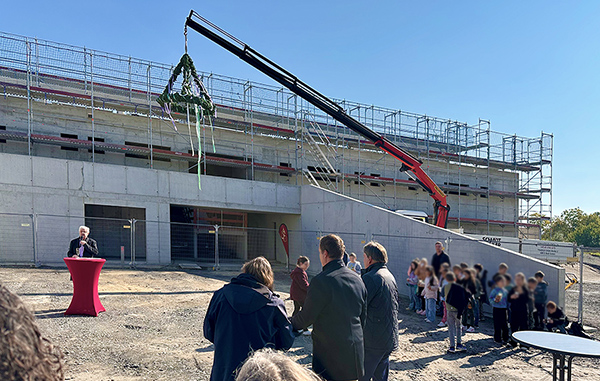 Der 2024 begonnene Bau wird nach Fertigstellung eine fünfzügige Grundschule samt Zweifeldsporthalle bieten und die Bedingungen vor Ort spürbar verbessern. Wenn die Bauzeitenplanung eingehalten wird, dann können die Schülerinnen und Schüler zum Jahreswechsel des Schuljahres 2026/2027 in die neuen Gebäude einziehen.
