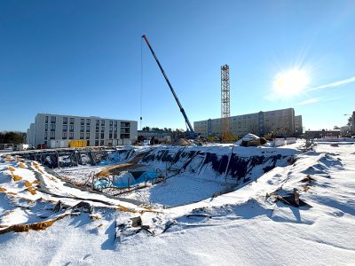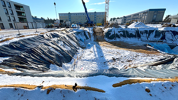 Auf dem Foto sind die beiden Unterkunftsgebäude (Erweiterung) und davor die Baugrube für den Neubau des Trainingszentrums zu sehen.
